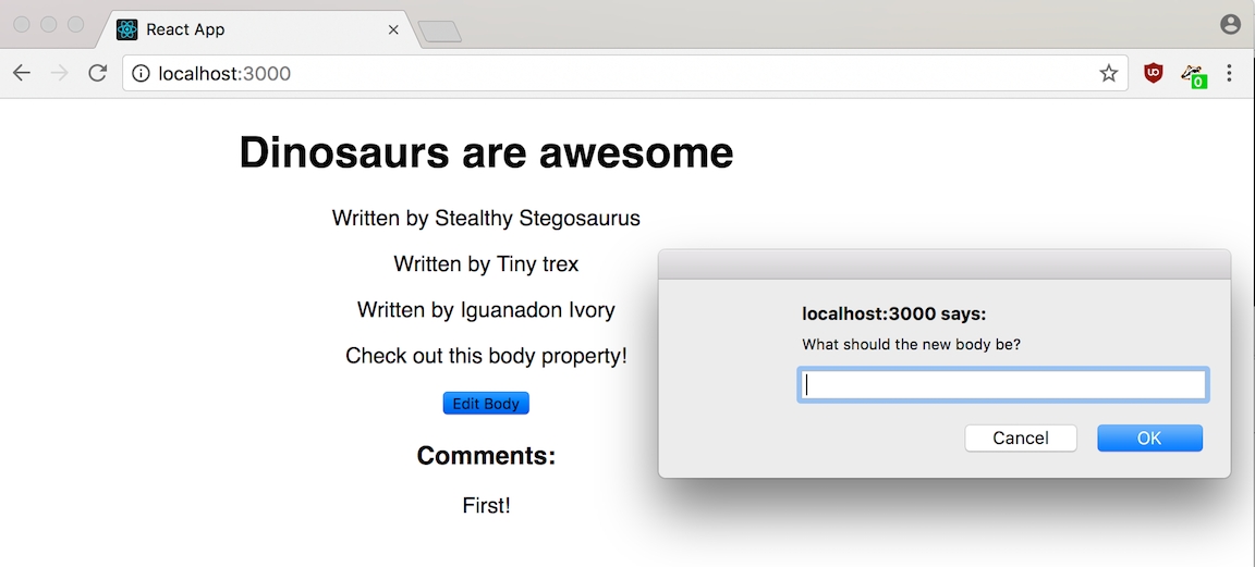 App'srender()method so that it uses thebodyfrom state, not props.Create a