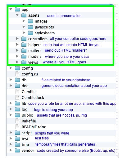 The main directory that we'll be working in is the app directory which contains our models, views, and controllers.