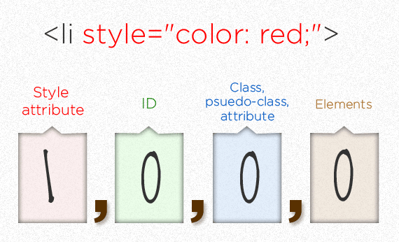 Every selector has its place in the specificity hierarchy, and if two selectors apply to the same element, the one with higher specificity wins. Overall, there are four distinct factors that define the specificity level of a given selector: inline styles, IDs, classes+attributes and elements. You can calculate CSS specificity with CSS Specificity Calculator: