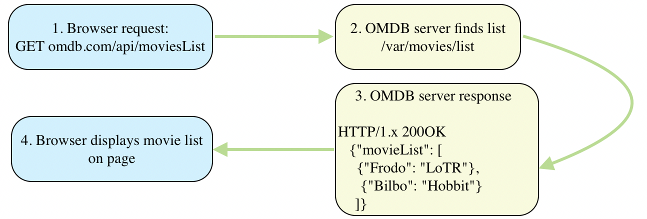 The browser packages this together using fetch() and sends it off to a server. The server then listens to your request and provides a response. It looks something like this: