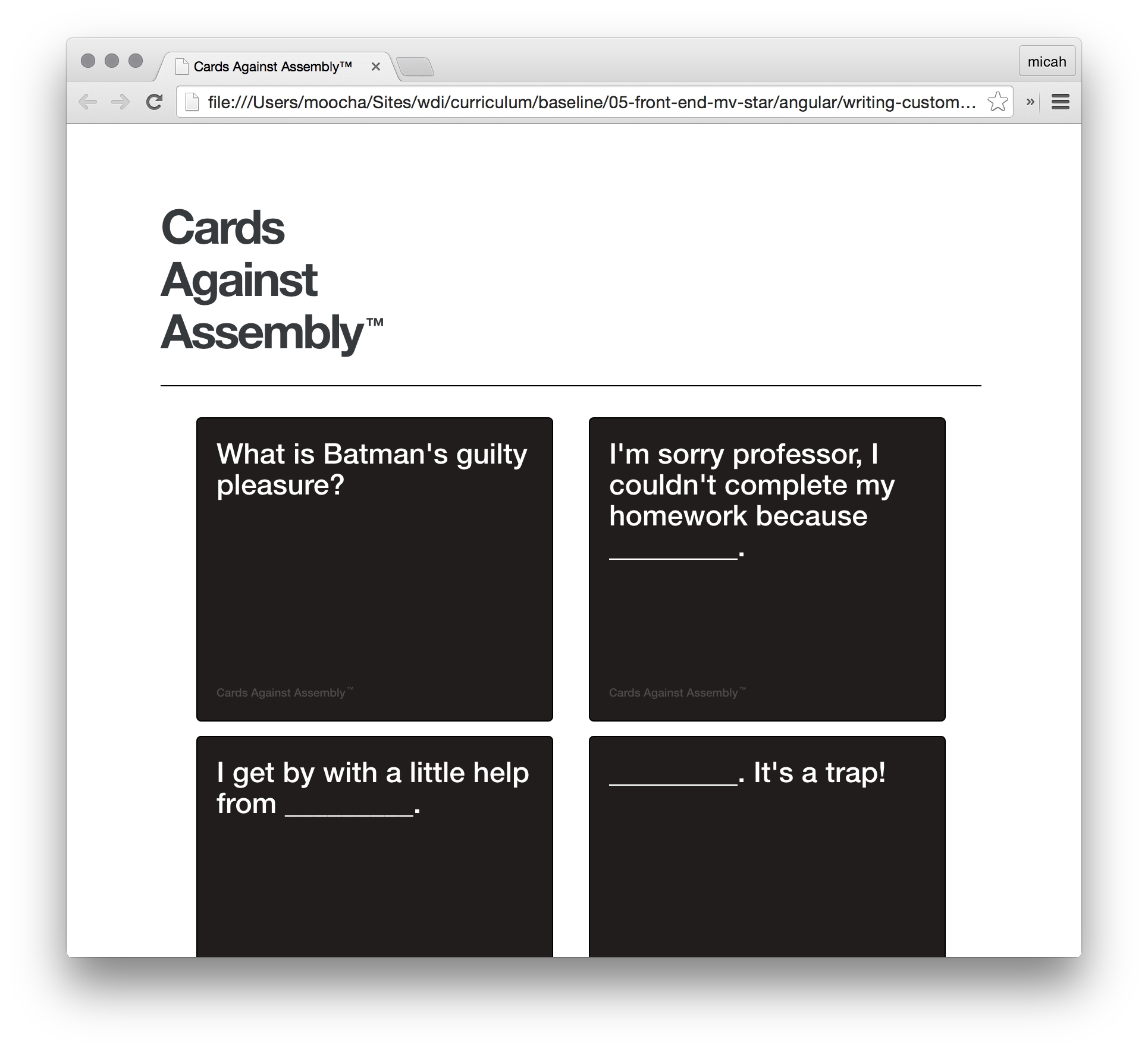 angular.module('CardsAgainstAssembly', ['CardCtrls', 'cardView']);TRY IT! So awesome! We've now got this much more readable index.html, with a very semantic HTML tag describing exactly what we want rendered.